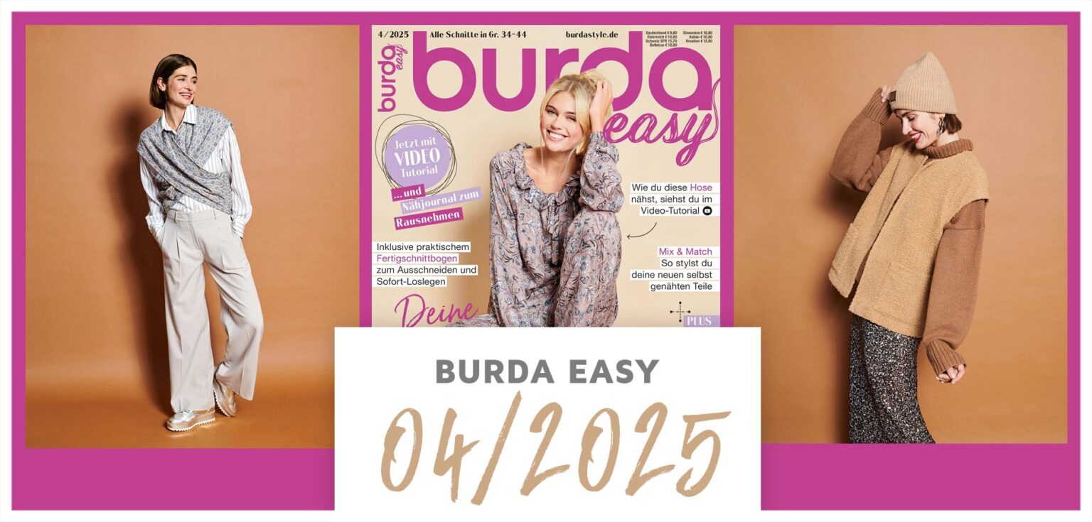 Die neueste burda easy 04/25-Ausgabe steht unter dem Motto „Cozy Chic zum Selbernähen“ und widmet sich modernen, bequemen Looks für einen entspannten Alltag zwischen Homeoffice und Freizeit. Im Mittelpunkt stehen lässige Capsule-Wardrobe-Modelle mit klaren Linien und zeitlosem Stil, die sich vielseitig kombinieren lassen. Die Schnitte sind bewusst einfach gehalten und eignen sich besonders gut für Nähanfängerinnen. Ergänzt wird das Heft durch praktische Extras wie Mix-and-Match-Ideen sowie ein Hosenprojekt, das den Einstieg ins Nähen erleichtert. Wie immer stehen wir Ihnen im Nähkurs bei allen Nähprojekten mit Rat und Tat zu Seite – ganz egal, ob Sie einen dieser Burda-Schnitte oder ein anderes Vorhaben verfolgen. Ebenso können Sie bei uns aus einem umfangreichen Sortiment verschiedenster Stoffe auswählen. Kommen Sie doch einfach mal vorbei!